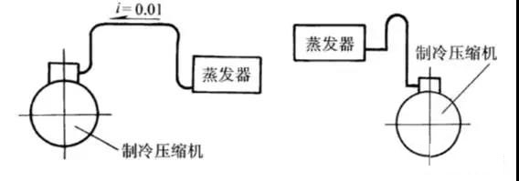 1)壓縮機(jī)的吸氣管應(yīng)有不小于0.01的坡度,坡向壓縮機(jī),如圖所示。