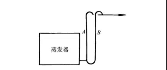 2)當(dāng)蒸發(fā)器高于制冷壓縮機(jī)時(shí),為了防止停機(jī)時(shí)液態(tài)制冷劑從蒸發(fā)器流入壓縮機(jī),蒸發(fā)器回氣管應(yīng)先向上彎曲至蒸發(fā)器的最高點(diǎn),再向下通至壓縮機(jī),如圖所示。