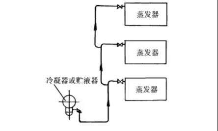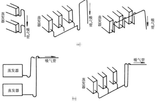 6)多組蒸發(fā)器的回氣支管接至同一吸氣總管時(shí),應(yīng)根據(jù)蒸發(fā)器與制冷壓縮機(jī)的相對位置采取不同的方法處理。