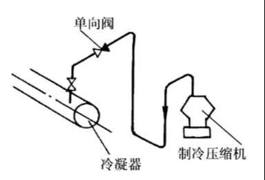 2)在不用油分離器時(shí),如果壓縮機(jī)低于冷凝器,排氣管道應(yīng)設(shè)計(jì)成一個(gè)U型彎管,如圖所示,以防止冷凝的液體制冷劑和潤滑油返流回制冷壓縮機(jī)