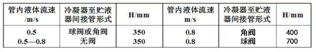 8)冷凝器與波動(dòng)式儲液器的高差應(yīng)大于300mm,最大負(fù)荷時(shí)液體制冷劑在管道中的流速及冷凝器液體出口至貯液器液面的必要高差H值見表。