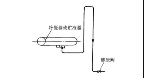 2)蒸發(fā)器位于冷凝器或貯液器下面時(shí),如液管上不裝設(shè)電磁閥,則液體管道應(yīng)設(shè)有倒U形液封,其高度應(yīng)不小于2m,如圖所示。