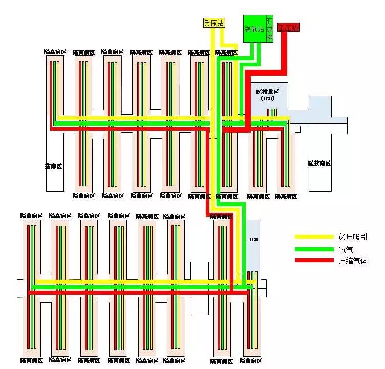 檢驗科自檢報告 07 醫用氣體系統設計原則 Design Principles 設計方案 醫院設置氧氣、負壓吸引、壓縮空氣等醫用氣體,管網系統由管道、設備帶、儀表、閥門及終端等組成。病房氧氣終端用量按40~80l/min·床,終端壓力按0.4~0.45MPa確定;負壓吸引終端用量按30~80l/min·床,終端壓力按-0.03~-0.07MPa確定;壓縮空氣終端用量按15~25l/min·床,終端壓力按0.4~0.45MPa確定。 氧氣氣源采用液氧罐,并預留罐車臨時供氧的接口。需根據應急臨時傳染病醫院的使用要求,充分考慮氧氣用量。共設6個20m3液態氧儲罐,液氧總儲量120m3;每個儲罐配置1200m3/h的汽化器,總汽化量7200m3/h,保證醫院整體氧氣供應量。 負壓系統由真空泵、水汽分離器、負壓真空罐、儀表及管道閥門組成,負壓吸引裝置的排氣經過高效過濾器過濾并消毒滅菌后排出。壓縮空氣系統由壓縮空氣設備源與壓縮空氣管網系統組成,配置的螺桿式壓縮空氣組二用一備。 室外液氧站 壓縮空氣機房 負壓吸引氣機房 病房醫用氣體設備帶 室外管網布置 氧氣、負壓吸引、壓縮空氣主管道由機房接出后埋地進入隔離病區內。隔離病區內醫用氣體主管主要鋪設于醫護區屋面,各病區分支管穿越各自屋面后進入相應區域內。南北區各分別設置一根DN150的氧氣總管及DN80負壓吸引總管,各區氧氣總管間設有旁通管,接入各護理單元的醫用氣體分支管上設有閥門。既可保證不同區域分批使用互不干擾,同時管道間互為備用有效提高供氧系統可靠性?倛D醫用氣體管道示意圖如下: 安裝與調試 目前各用氣區域已經陸續通氣,氧氣輸送管道壓力平穩,輸送量較為穩定。液氧貯罐及汽化器根據實際使用量分批投入使用,可有效保證氧氣供應量。 08 負壓隔離病房廢氣排放 對環境的影響模擬分析 Analysis 模擬方案